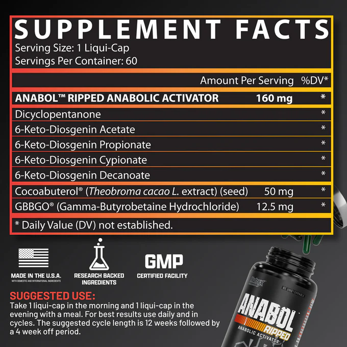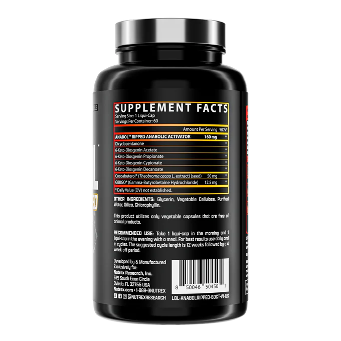 Pack on mass and keep a hard, shredded look – with Nutrex ANABOL RIPPED – the cutting-edge formula designed for those who want to build serious muscle while shedding unwanted fat. This two-in-one powerhouse combines hardcore muscle-building compounds with two effective fat-burning agents – so you can carve out a lean, muscular body. With its advanced liquid-cap technology – ANABOL RIPPED ensures rapid delivery and absorption of its potent ingredients. They help foster an optimal anabolic environment for enhanced muscle growth and recovery – but also ignite your metabolism for more efficient fat loss. Are you ready for a transformation that brings the best of both worlds – massive gains and a shredded look? Get your first cycle of ANABOL RIPPED now and experience the ultimate synergy of unrivaled muscle growth and fat loss!